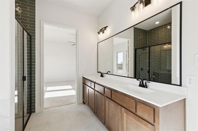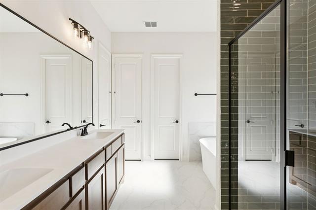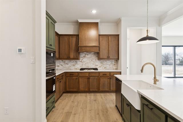 MLS# 21160539 - Built by Sandlin Homes - Ready Now! ~ The Bellaire features four spacious bedrooms, three baths, and upgraded with a third car garage, 12’ sliding glass door at the great room for seamless indoor-outdoor flow, and a box bay window that brings in natural light to the primary suite. The converted living to bedroom with full bath is ideal for guests and multigenerational living. Additional structural upgrades include an added study, oven tower, custom wood hood, and pendant lighting over the island. The designer-curated kitchen features stained perimeter cabinetry contrasted by a green painted island, topped with gold-veined 3cm quartz countertops and a coordinating picket backsplash. Gold and black plumbing fixtures continue throughout the home to create an elevated, curated look. The primary bathroom showcases light aloe-colored shower walls extending to the ceiling, paired with gold-veined tile flooring for a spa-like ambiance. Upgraded tile selections enhance the fireplace surround, secondary bathrooms, and utility room, completing the upscale aesthetic.