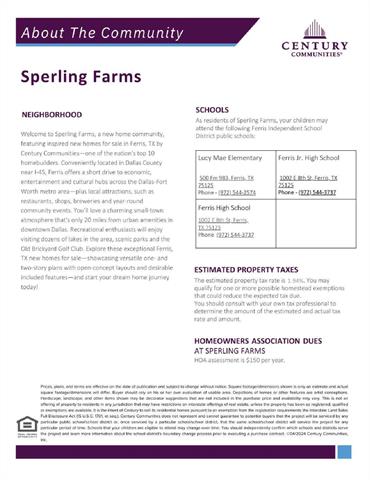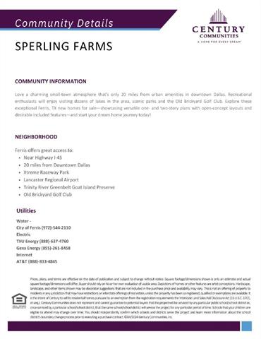 Head East on Belt Line Rd from 35E. Right on Ferris Rd. Turn right. Left on FM 664. Right on FM 983. Left on Sperling Ln into community. Right on Norfolk Dr. Left on Aberdeen. Right on W 10th St. Left on Dorset. Left on Suffolk. Home is on your right! Model home located at 405 Sperling Lane!