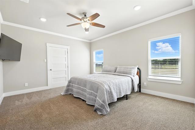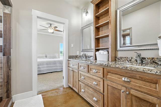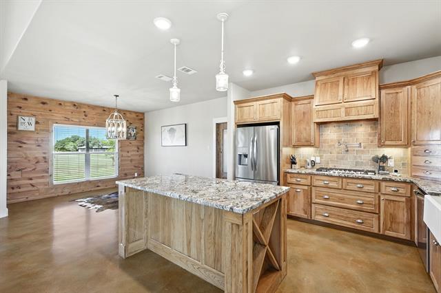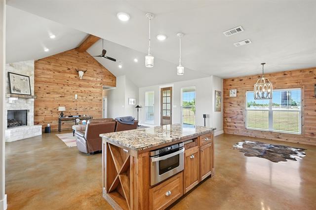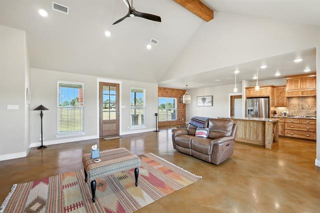 Preferred lender offering up to 1% of loan value in credits to buyer. Beautiful ranch-style home on 10 ag-exempt acres with no restrictions and no HOA! This well-maintained property is fenced and ready for livestock, offering the perfect blend of peaceful country living with city conveniences just minutes away. The spacious open floor plan is filled with natural light and features stunning wood beam accents in the living area. The kitchen includes custom cabinetry, granite countertops, and a large island—ideal for both everyday living and entertaining. The primary bedroom offers views of the property and a beautiful en-suite bath with rock-style finishes in the shower and ample storage. Outside, enjoy quiet mornings or Texas sunsets on the oversized covered porches. The 30x40 workshop is wired for welding, includes two RV hookups, has it's own electricity, and provides plenty of space for storage. Whether you’re looking for a place to spread out, raise animals, or simply enjoy the outdoors - this property has it all!